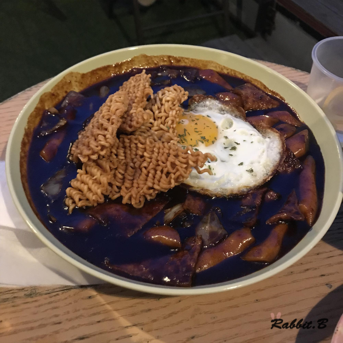 그렇게 수다 떨고, 칵테일도 마시며 셀카 삼매경에 빠졌다가 다시 출출해진 나머지 저희는 '불 짜장 떡볶이'를 시켰답니다. 돼지 두 명...ㅋㅋㅋ 처음부터 친구가 먹고 싶다 했는데 저는 처음에 고기가 당기고 짜장이 안 당겼어요. 그러다 시간 지나니까 출출해졌을 때 뭐든 시켜도 괜찮겠다 싶어서 시킨 건데 맛있었어요. 떡도 쫄깃하고 반숙 계란은 또 사랑이고, 라면땅? 처럼 딱딱하게 나오는데 나름대로 맛있더라고요. 근데 전 딱딱한 것보다 부드러운 걸 좋아해서 그냥 짜장면처럼 나와도 좋겠다 싶었어요.