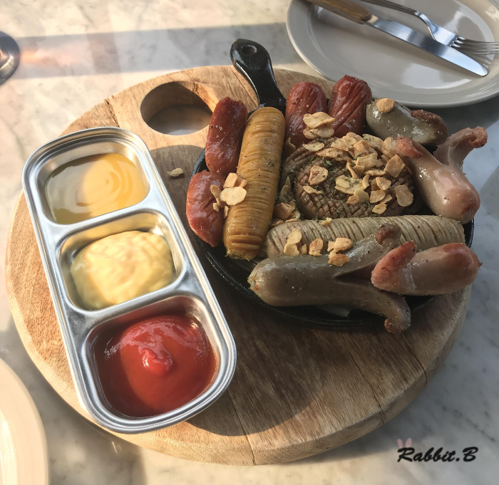 머스터드, 치즈, 케첩 소스들이 나와 다양하게 찍어 먹어 볼 수 있어서 좋았어요. 소시지 종류도 물론 다양해서 재미있었고, 제가 좋아하는 마늘 후레이키까지 올려 있어서 식감 좋게 아주 잘 먹었답니다.^^ 거의 저거 시키고 10분 만에 먹은 느낌이에요. 친구랑 저랑 같은 말 한 게 "우리 시킨 지 얼마 안 되지 않았어? 배고팠나 보네." 고기 is 뭔들~ 고기는 사랑이죠.