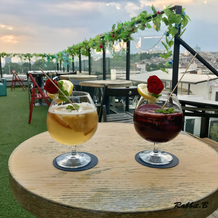 이 날은 덥기도 더웠지만 햇빛도 장난 아니지, 습기 장난 아니지 했던 날. 그래서 루프탑 바에 올라가서 사진도 찍고 새로운 칵테일도 먹고 싶은데 올라간 사람들도 없을뿐더러 막상 에어컨 시원한 바람 쐬며 편하게 실내에서 먹다가 습한 바람에 밖에 나가기 무서워서,, 거의 6시 반에서 7시 정도..? 올라간 것 같아요. 여러 손님들 중에 저희가 첫 번째 루프탑 손님이었어요. 다들 눈치 게임?ㅋㅋㅋ
